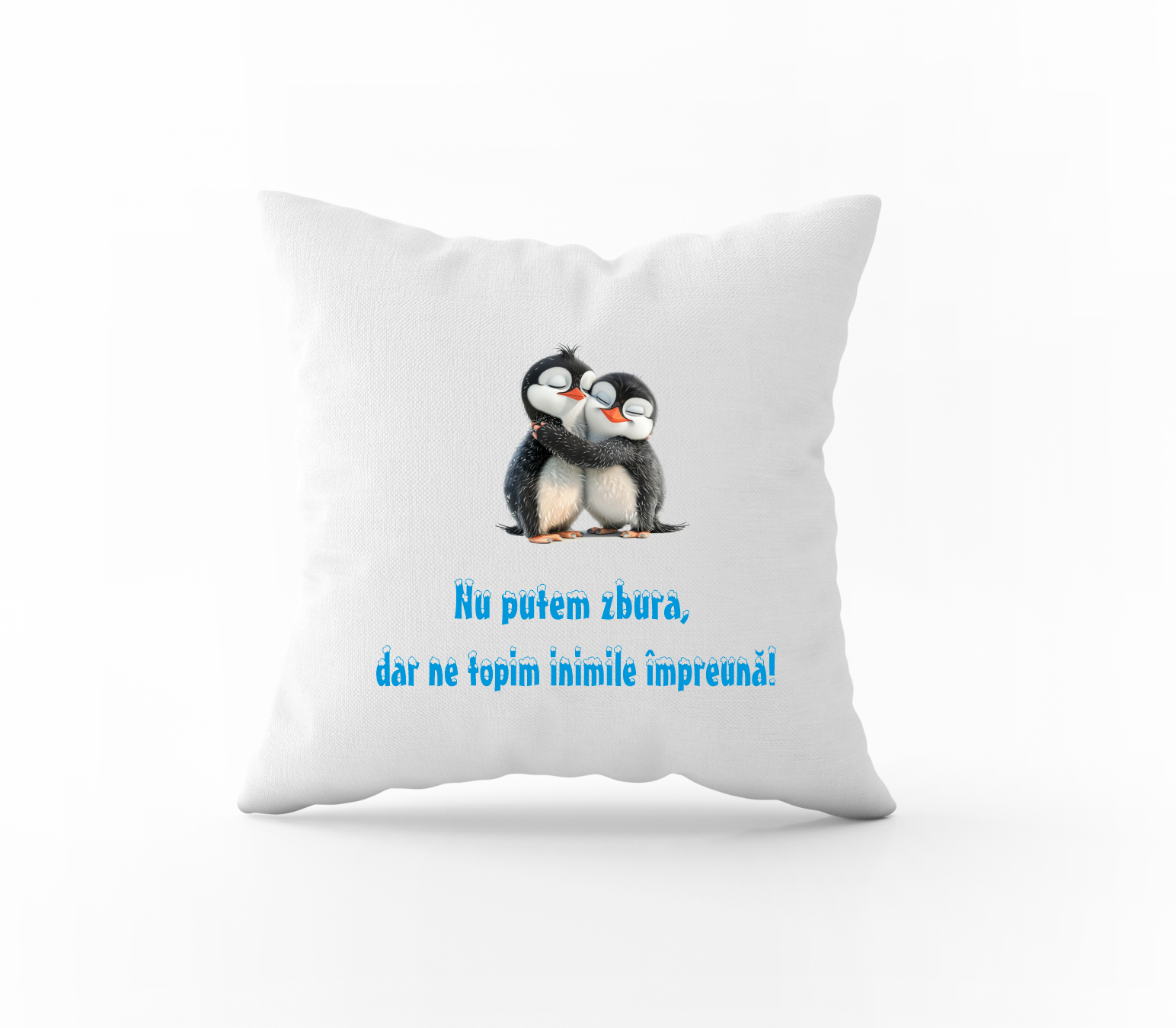 Prima pagină » Magazin » Pernă personalizată „Nu putem zbura, dar ne topim inimile împreună!”